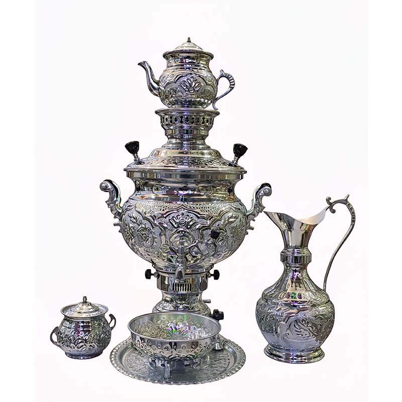 سماور گازی شاهکار مهدیس ۸ لیتر قلم گل و مرغ به همراه سرویس