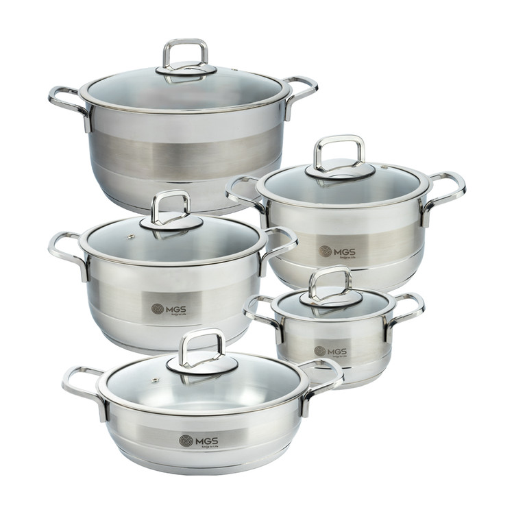 این سرویس قابلمه 10 پارچه استیل شامل چهار قابلمه و چهار درب پیرکس بعلاوه یک تابه دو دسته همراه درب است. جنس این ست، استیل ضد زنگ است. نحوه ساخت این سرویس قابلمه 10 پارچه استیل فورج و دستههای آن به بدنه متصل شده است.