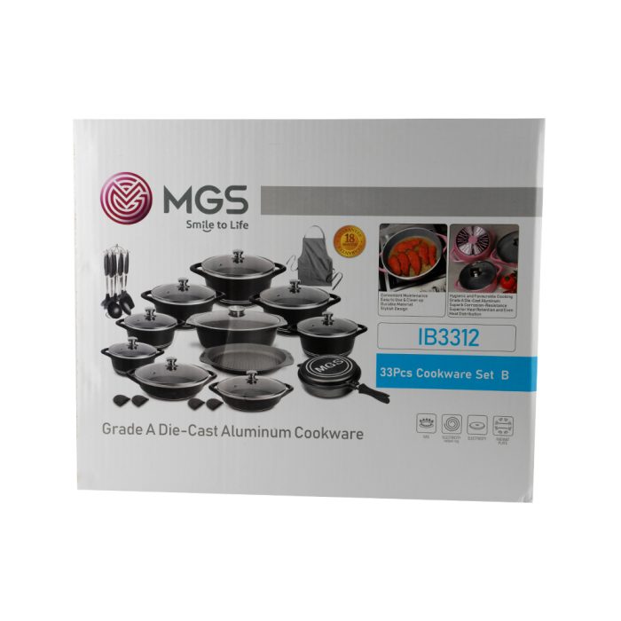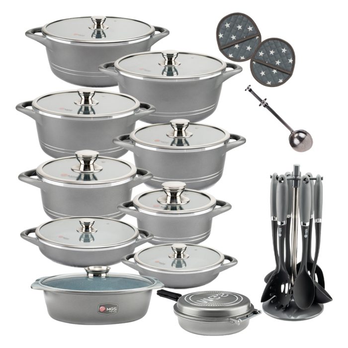 این سرویس قابلمه 33 پارچه ایتالیا شامل شش قابلمه و شش درب پیرکس بعلاوه دو تابه دو دسته و یک تابه تک دسته دوطرفه همراه درب، یک مرغ پز سه پارچه، یک ست هفت تکه کفگیر و ملاقه، یک عدد پیشبند و چهار عدد دستگیره است. جنس روکش این ست، گرانیت نچسب است. نحوه ساخت این سرویس قابلمه 33 پارچه دایکست و دستههای آن به بدنه متصل است.