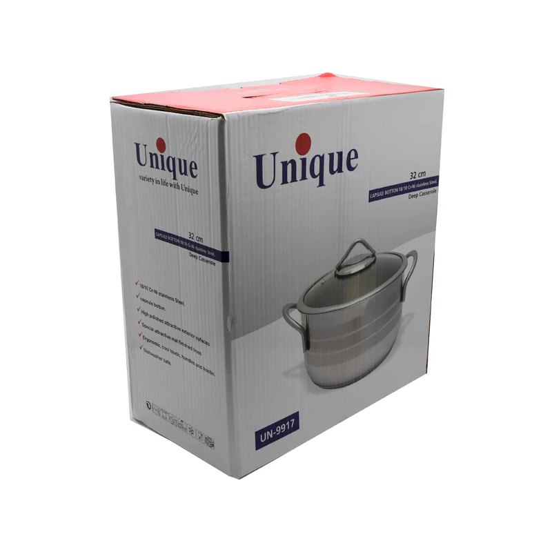 قابلمه استیل یونیک کد 9917 با سایز 32 سانتیمتر، گزینهای مناسب برای پخت غذا در حجم بالا و خانوادههای پرجمعیت است. بدنه این قابلمه از استیل ضدزنگ با کیفیت ساخته شده است که در برابر حرارت، ضربه و شستوشوی مداوم مقاوم بوده و در طول زمان تغییر رنگ نمیدهد.